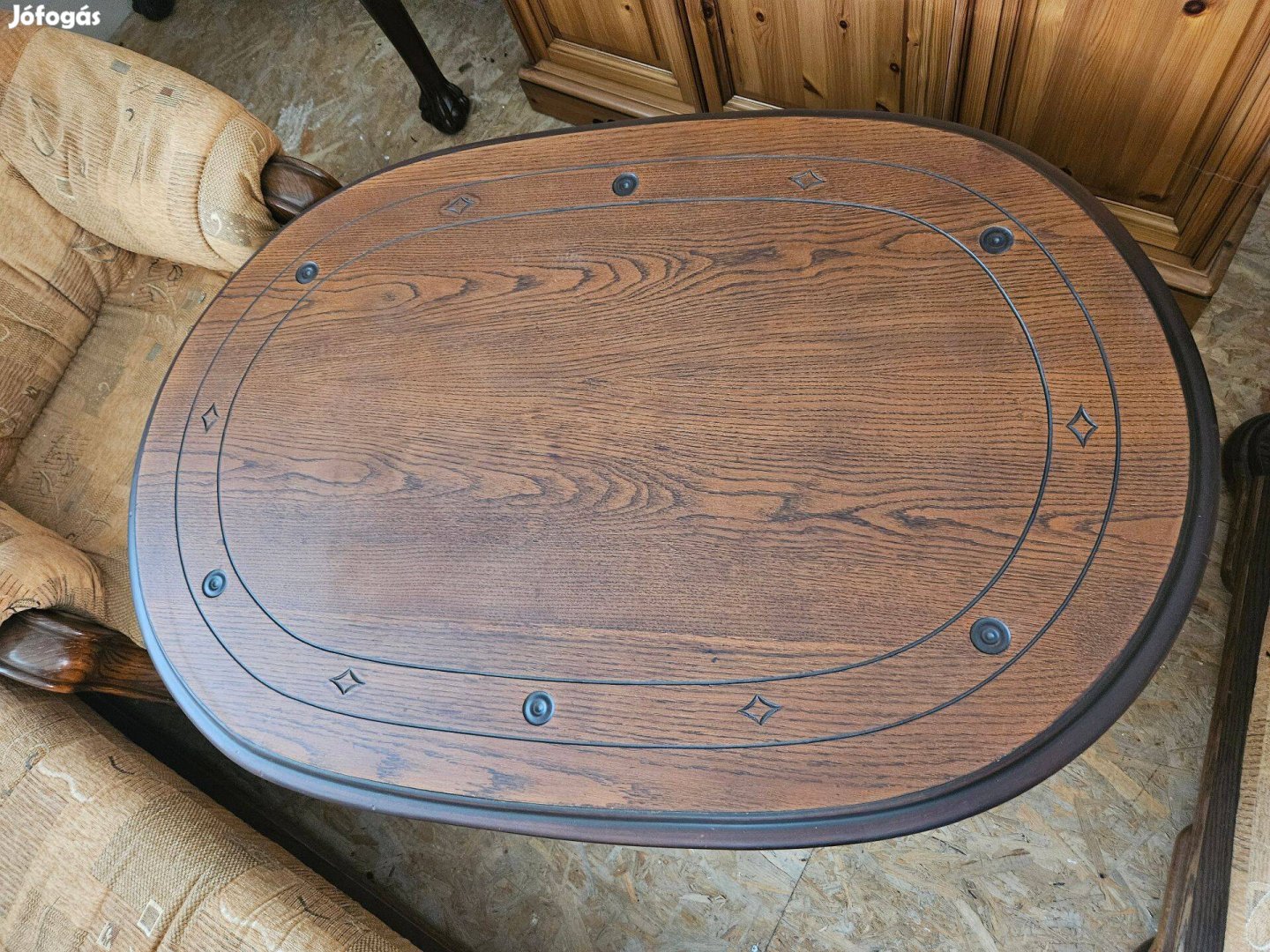 Nagyon szép kellemes meleg- barna színű tölgy dohányzóasztal.Gyönyörű faragott lábakkal. Az asztal lapján kis minta bemarásokkal.