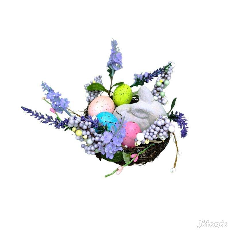 Ez a kedves húsvéti dísz kosárral egy természetes rost nyuszit ábrázol fűfészekben, színes tojásokkal díszítve. A természetes hatású anyagok és a vidám tavaszi színek barátságos, ünnepi hangulatot teremtenek.