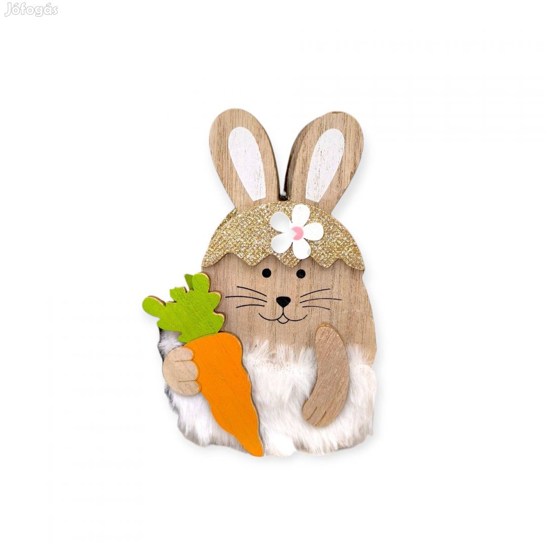 Dekoratív húsvéti asztaldísz fa nyuszi formában, puha műszőr részletekkel és sárgarépa motívummal. Kedves, tavaszias hangulatot teremt az ünnepi asztalon, polcon vagy komódon. Természetes megjelenésének köszönhetően jól illeszkedik klasszikus és modern húsvéti dekorációkhoz is. Kizárólag dekorációs célra ajánlott.