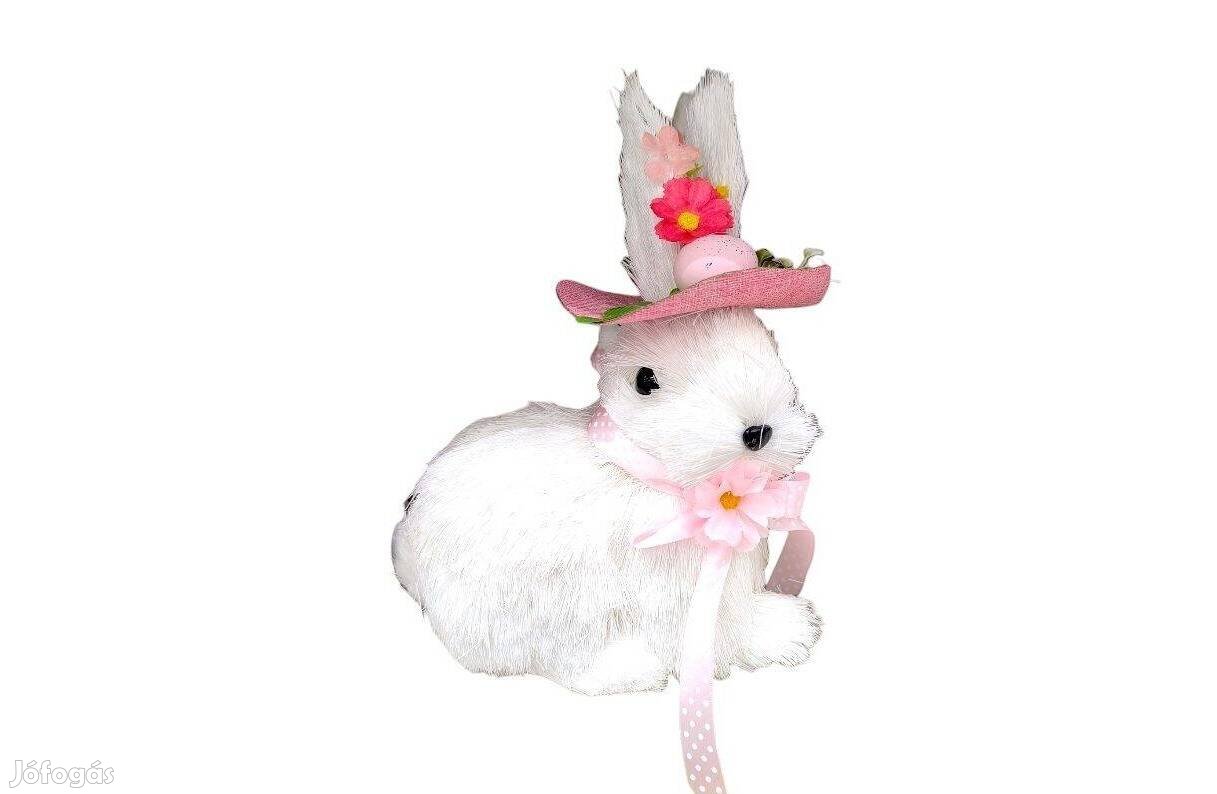 Húsvéti természetes rost figura fehér sapkás nyuszi rózsaszín virágo