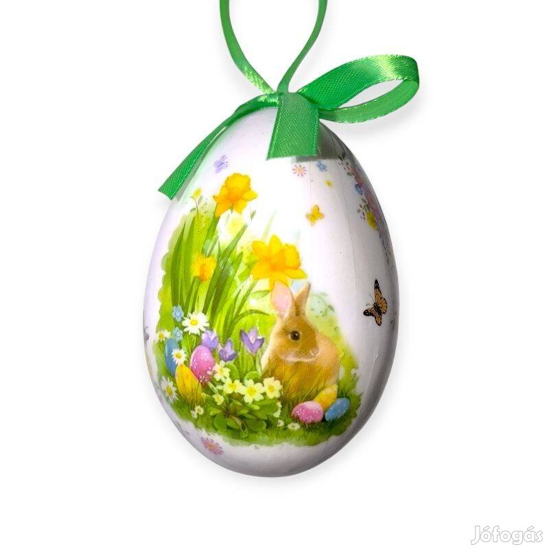 Elegáns és tavaszias húsvéti tojás dekoráció fehér alapon, aranyos nyuszis és virágos mintával. Tökéletes választás ünnepi lakásdekorációhoz, húsvéti asztaldísznek vagy ajándékkiegészítőként, hogy meghitt és friss hangulatot teremts otthonodban.
