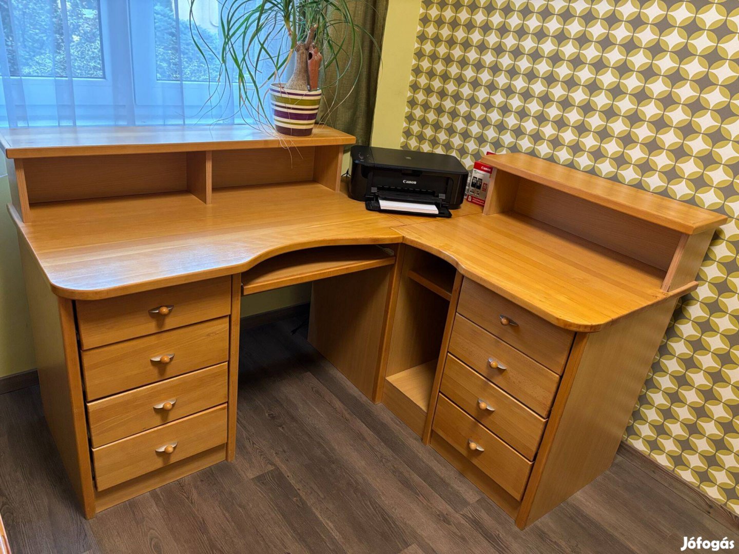 Eladó egyedi készítésű sarok íróasztal. Masszív építésű, 3 részből áll. Az asztallap és a fiókfrontok fából vannak, egyébként bútorlap. Befoglaló méretek: 134 x 168cm. Magasság: 75 cm + 22 cm magasítás. Szállításban nem tudok segíteni.