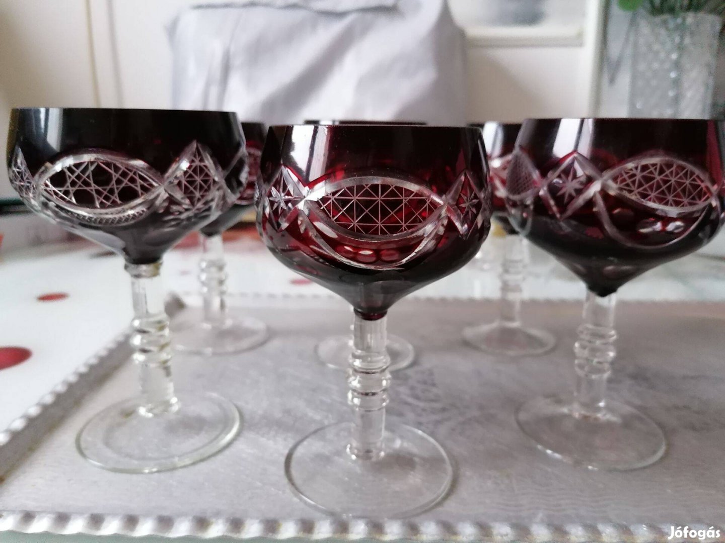 Csiszolt kristály, mély bordó színű 6db boros - pezsgős hibátlan állapotú pohár eladó, Miskolcon.