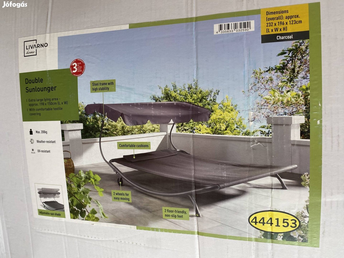 Livarno home kétszemélyes napozó ágy nyugágy, állítható napellenzővel eladó. Mérete: 232x196 cm. Kerekekkel felszerelt a könnyebb mozgathatóság érdekében. Teljesen új, bontatlan gyári dobozában. Miskolcon átvehető, vagy GLS szállítással megrendelhető. Nézd meg a további termékeimet.