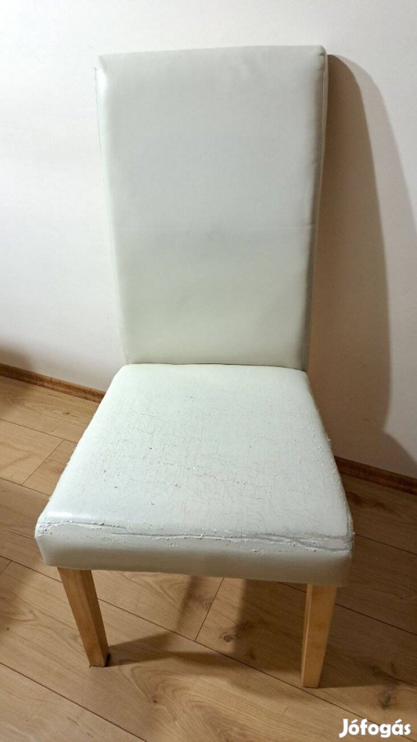 6 db műbőr étkezőszék, néhol kopott, a műbőr repedezett. Fa anyagú, jó állapotban.