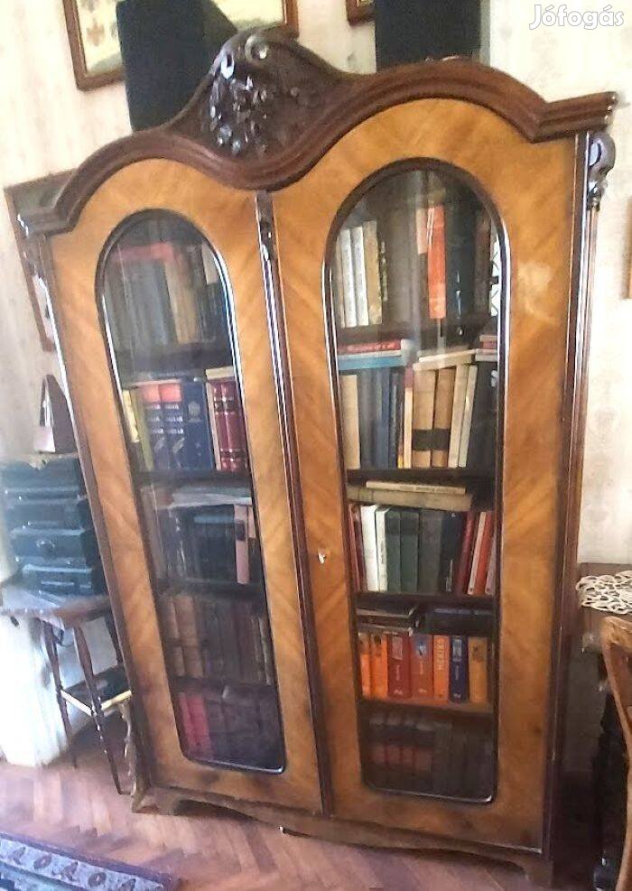 Eladó elegáns, 20. század első feléből származó, neobarokk stílusú, dió furnérozott antik könyvszekrény és ruhás szekrény külön is.