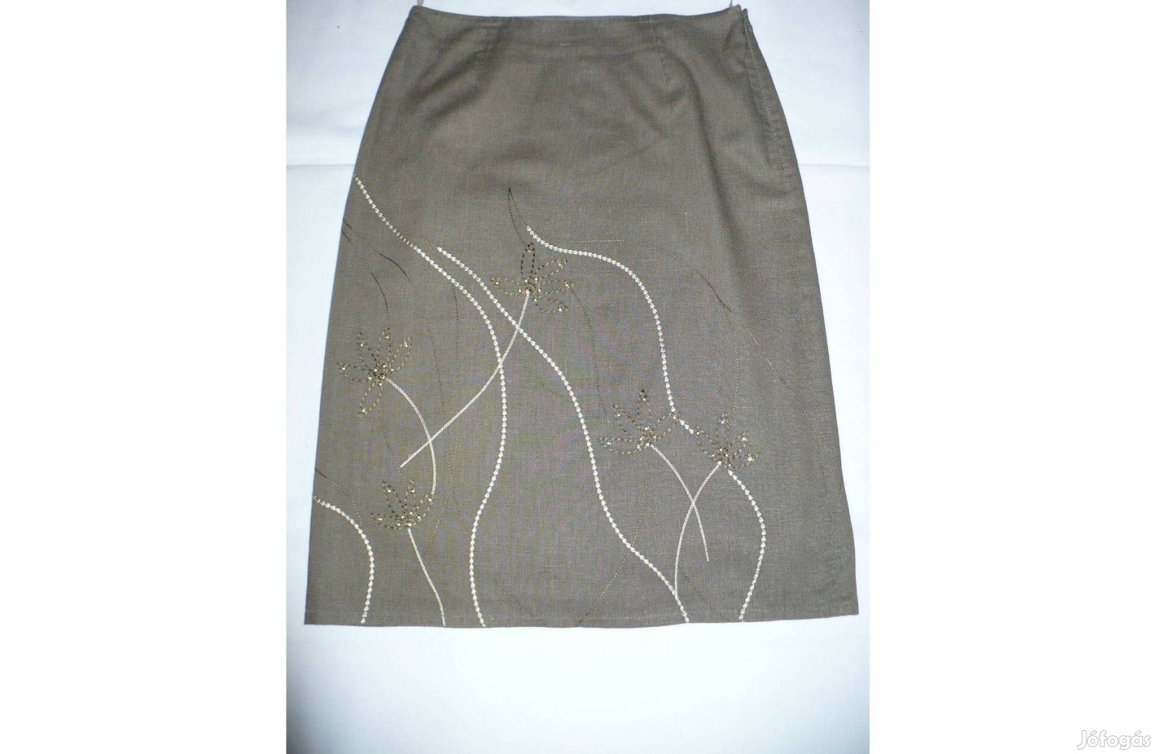 Jó állapotú Next keki színű női vászon szoknya, bélelt, hímzéssel és flitterekkel, hossza: 64, derékbőség 77 cm