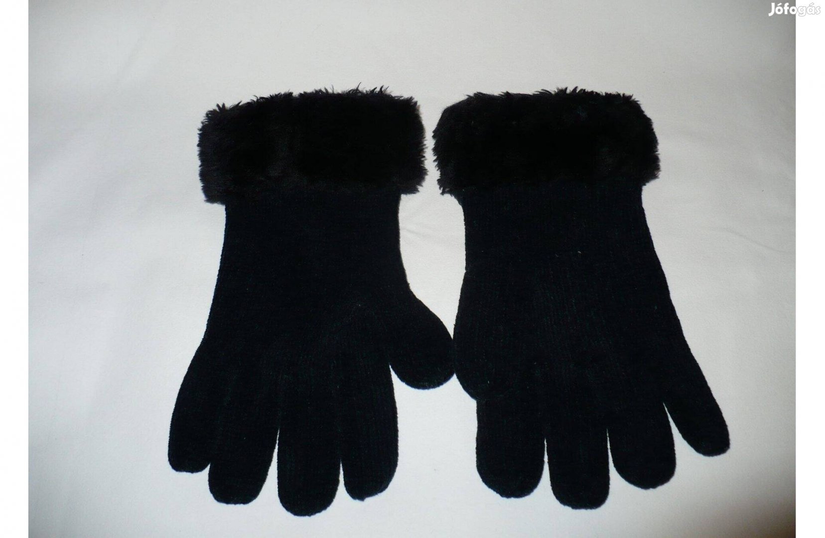 Fekete női zsenília kötött kesztyű, kb. M-es méretben, műszőrme díszítéssel
