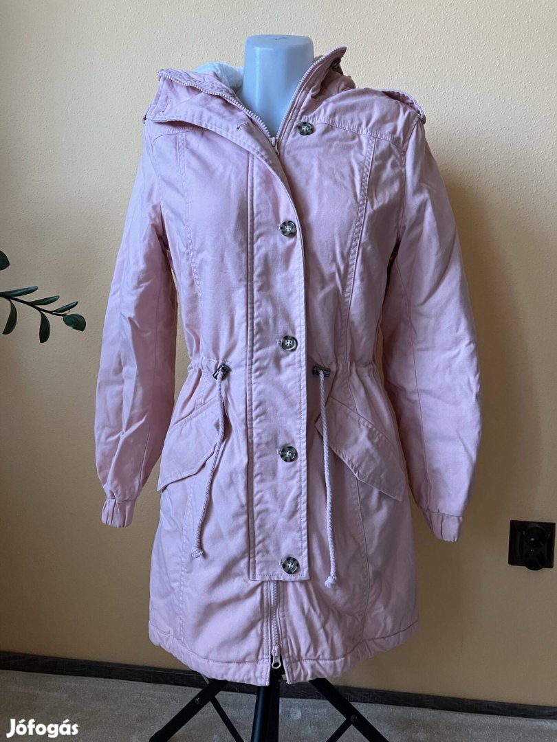 Halvány rózsaszín parka kabát, kívül erős pamutvászon, belül hófehér teddy bélés, derekán zsinórbehúzóval. A cipzár 2 irányú.