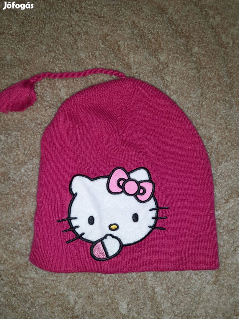 Vékonyan kötött bojtos sapka Hello Kitty felirattal, 122-128-as méretben. Magassága 20 cm.