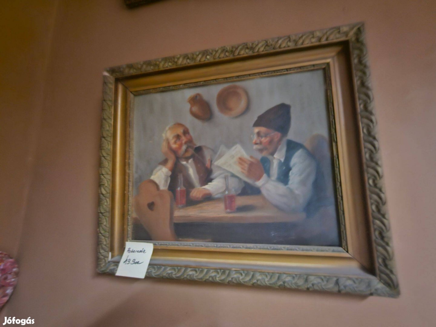 Nagyon jó hangulatú festmény. Olajjal farostra.Poharazó férfiakat ábrázol.Arany színű keretben.