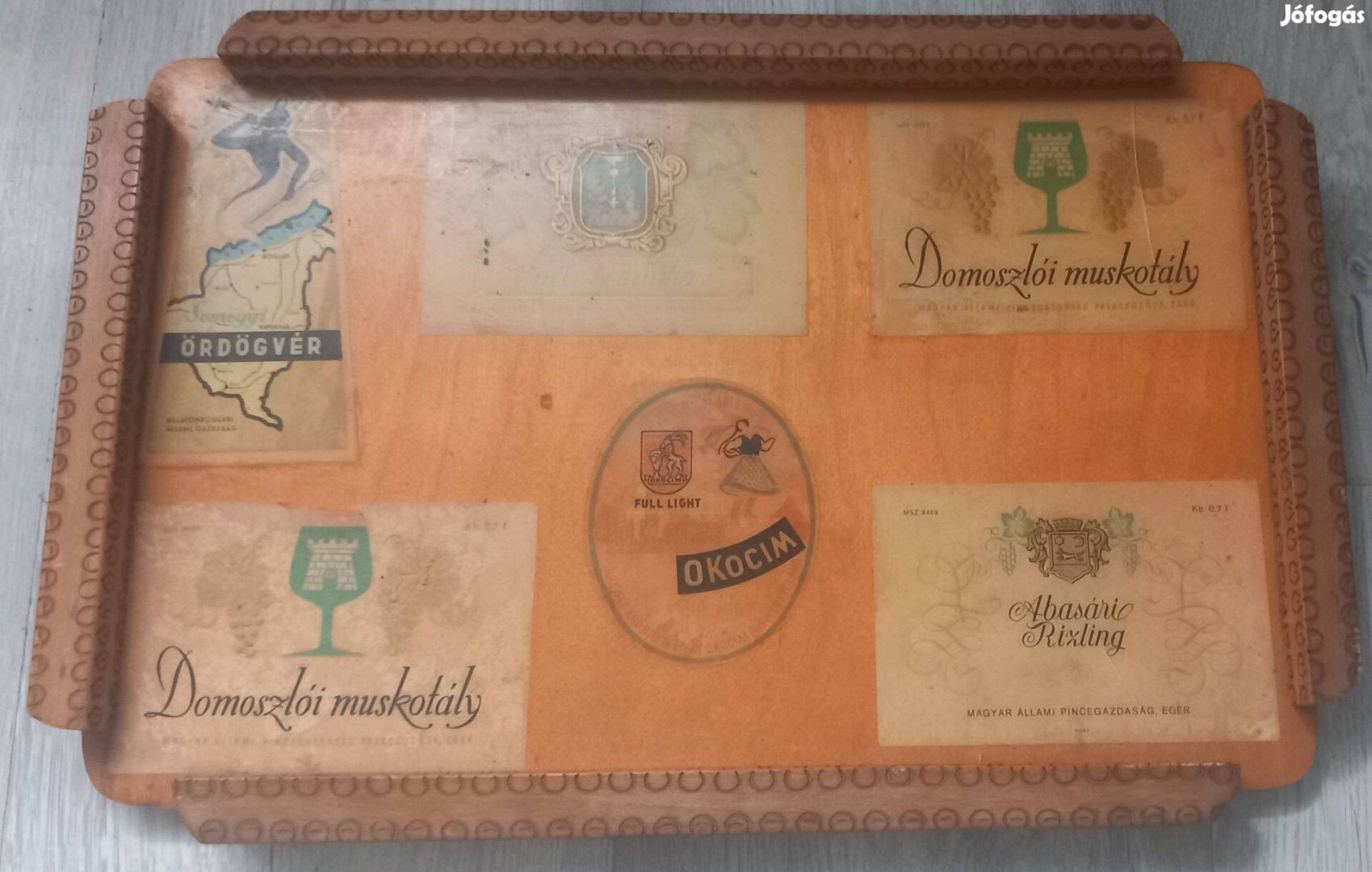 Eladó a képeken látható, autentikus retro fa tálca, melyet lakkozott boros- és italcímkék díszítenek (pl. Domoszlói Muskotály, Abasári Rizling). Igazi békebeli hangulatot áraszt, kiváló dísze lehet egy borospincének, konyhának vagy nappalinak.
