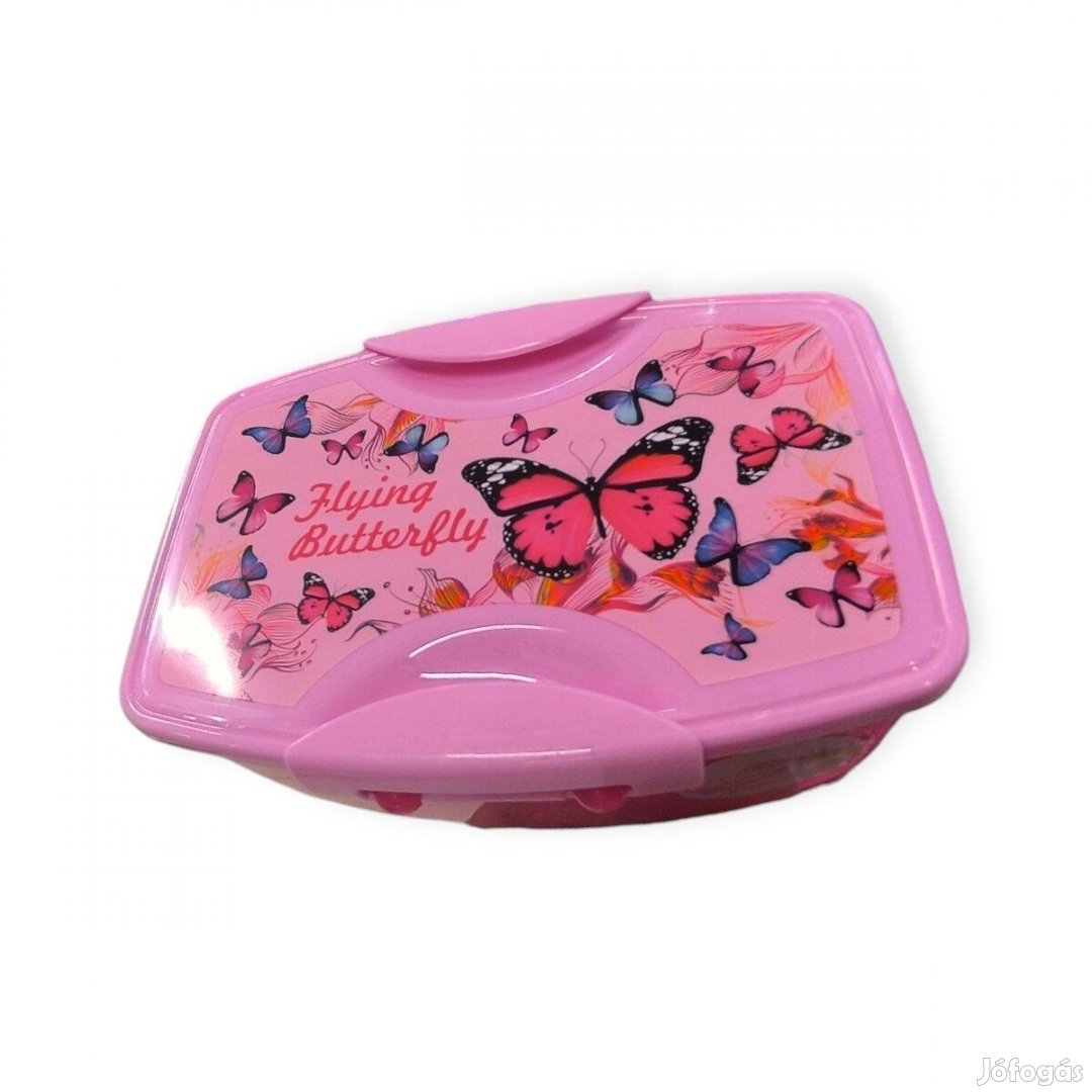 Rózsaszín pillangós uzsonnás doboz lányoknak 1,1 L evőeszközökkel