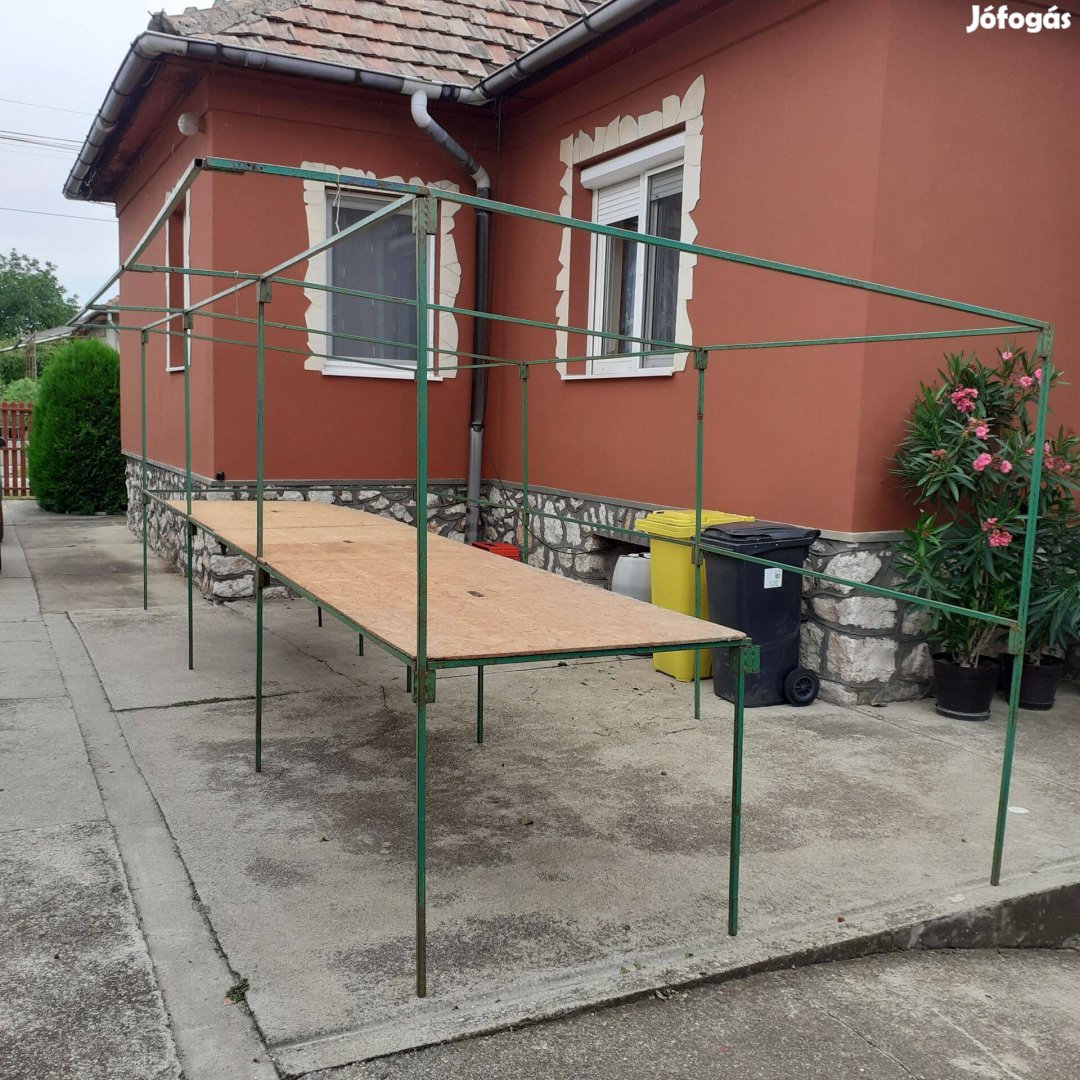 Eladó a képeken látható elemekből építhető sátorváz, 6m hosszú, 2m magas az elején, 2m széles, osb asztallal együtt.tel: 30/9219607