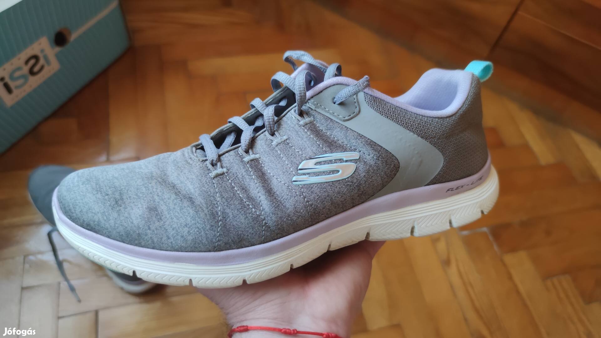 Újszerű, szép, Skechers Flex Lite márkájú, szürke színű, lila betéttel, szuperkönnyű, minőségi, hajlékony talpú, 41- és méretű, sportcipő!