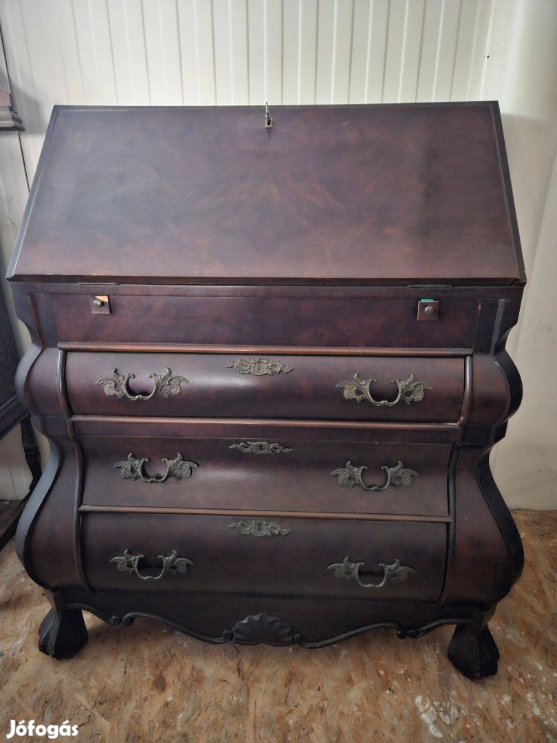 Szép formájú un. hasas barokk büró. Sötétebb árnyalat. A lenyíló rész zöld borítású. A belső részében kis fiókokkal, fakkokkal.