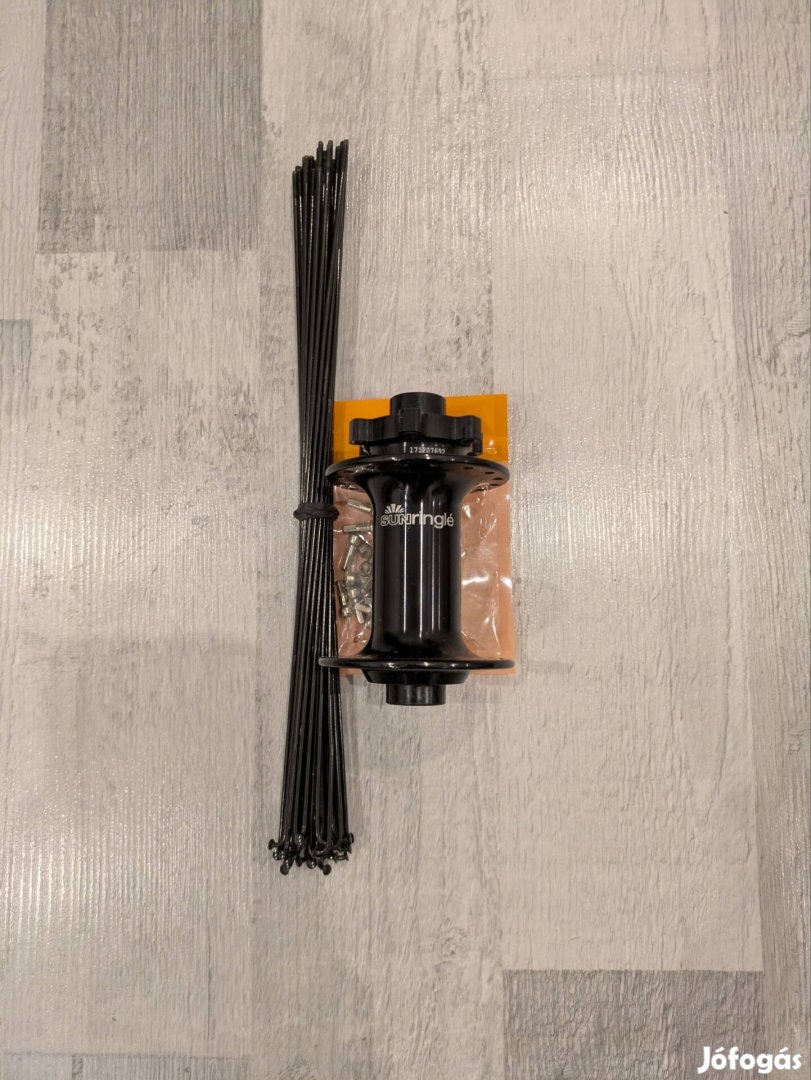 Sunringlé SRC 110 első agy újszerű állapotban, 32 küllős, 6 csavaros tárcsa felfogatás, 15x110 Boost tengelyhez, ipari csapágyas, 277 mm hosszú fekete küllőkkel (27,5" felnihez) és ezüst színű anyákkal