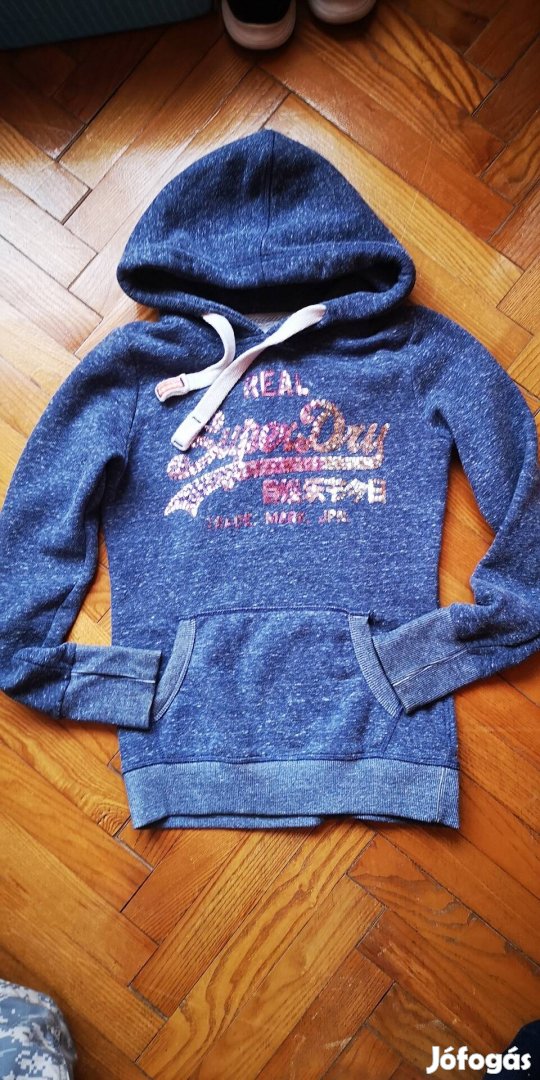 Superdry márkájú, Újszerű, szürkéskék/acélkék/ - rózsaszín flitteres Xs-es méretű, vastag, meleg, szép női kapucnis felső.