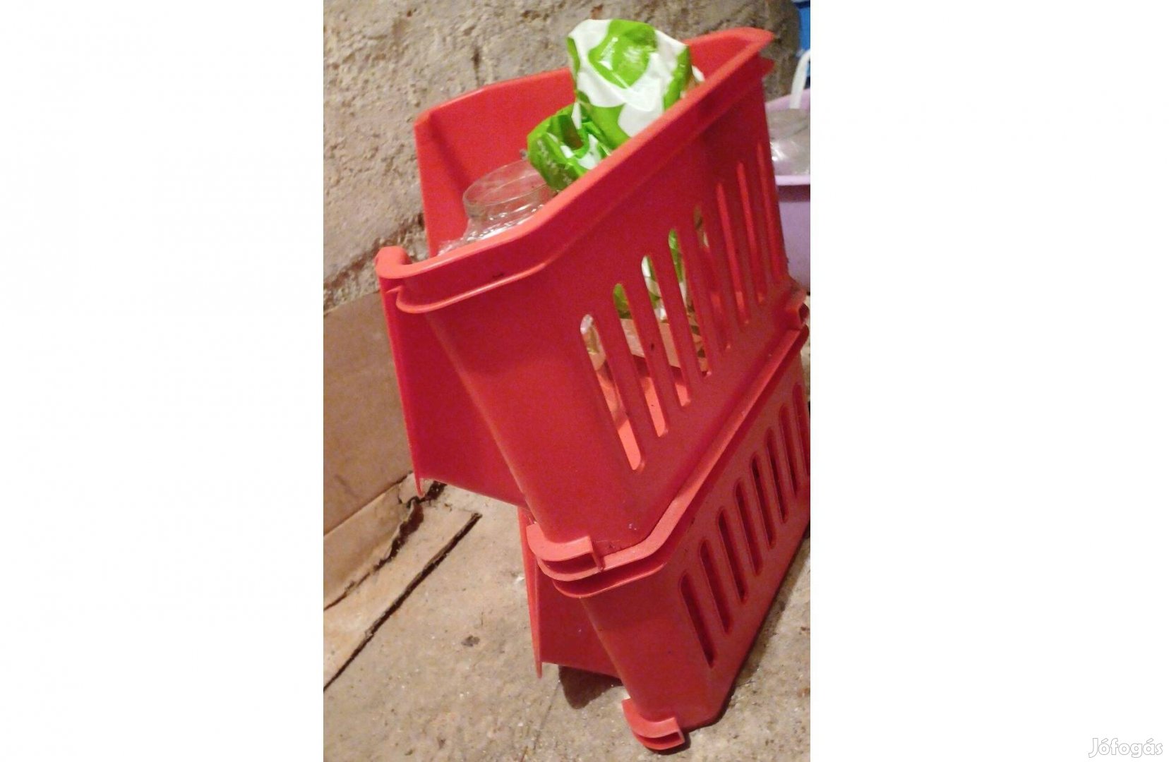 Műanyag tárolódoboz, erős, elől nyitott egymásra rakhatók. Magasság 22 cm oldala 33 cm elől a nyitott rész 30 cm