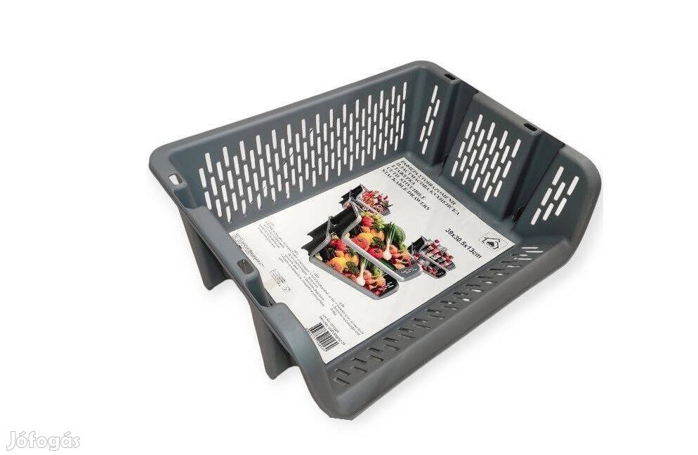 Szürke tárolókosár nyitható, perforált oldalakkal, amely praktikus szellőzést biztosít.