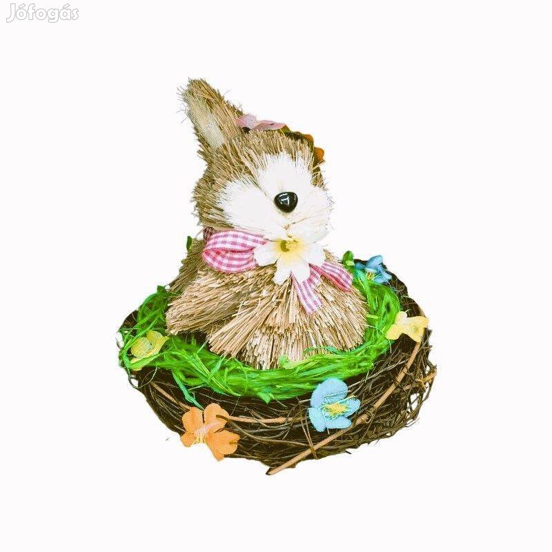 Ez a hangulatos húsvéti díszkosár egy kedves természetes rost nyuszit ábrázol, fűfészekben elhelyezve, színes tojásdíszekkel körülvéve. A természetes hatású megjelenés és a tavaszias színek meghitt, ünnepi atmoszférát teremtenek.