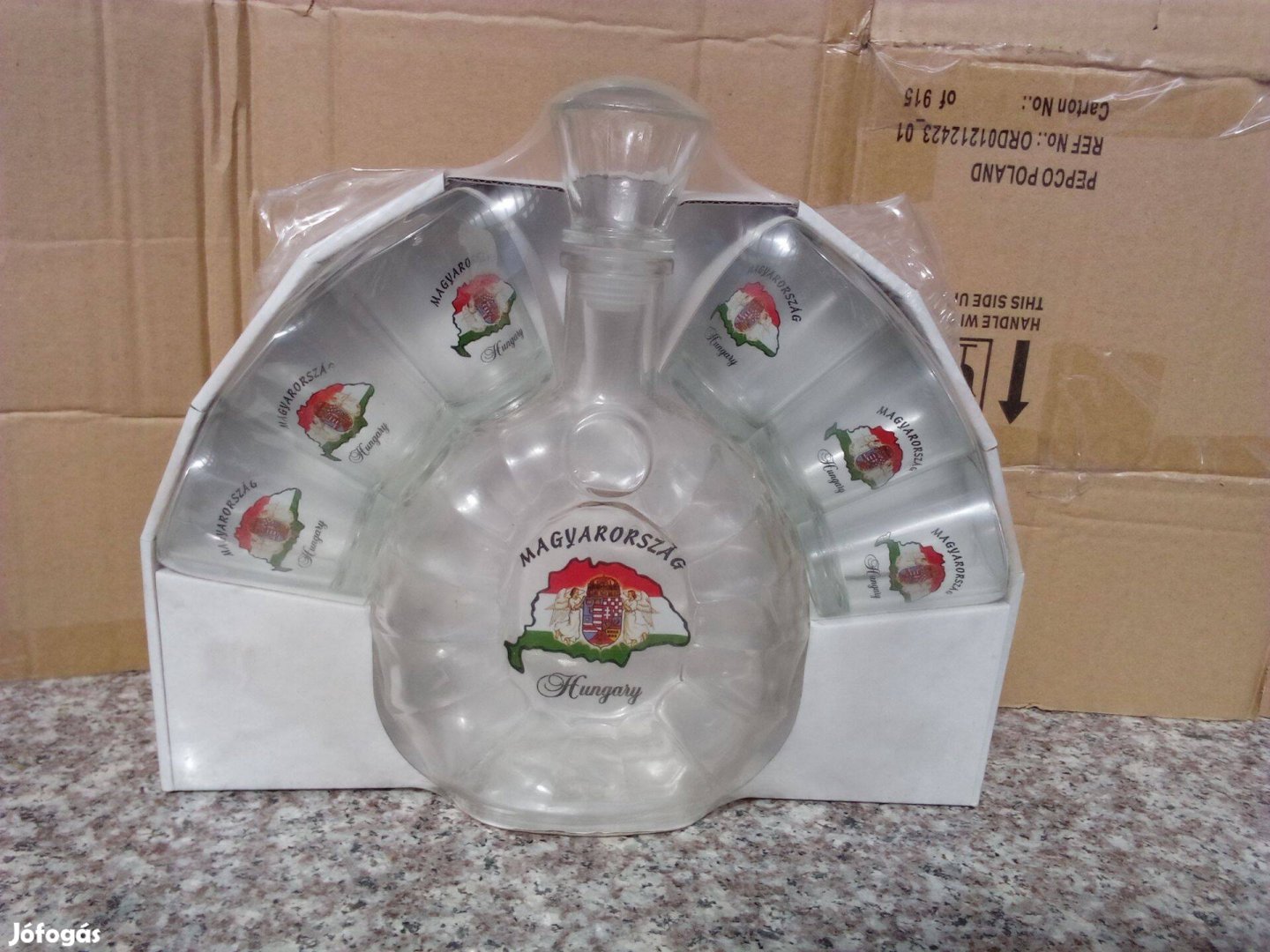Új ajándékozható, csomagolt pálinkás, stampedlis készlet Hungary felirattal. 6db feles pohár + kiöntő