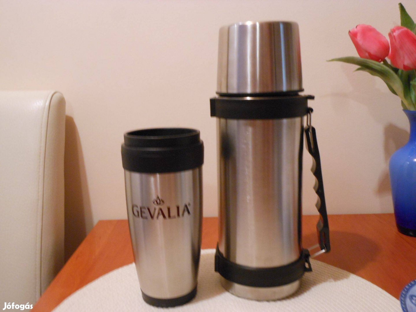 Rozsdamentes acél utazó duplafalú termo kávésbögre (Gevalia svéd márkájú, Vintage stílusú). Tárolás során a külsején néhol pici halvány karc keletkezett.