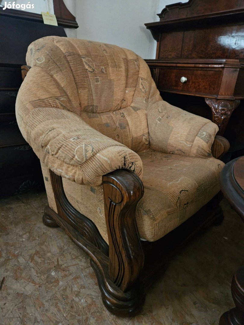 Nagyon szép tölgy vázzal készült ülőgarnitúra. A könyöklőnél szolíd faragással. Zsenílía kárpittal. 3+1+1 kanapé+ 2 fotel.