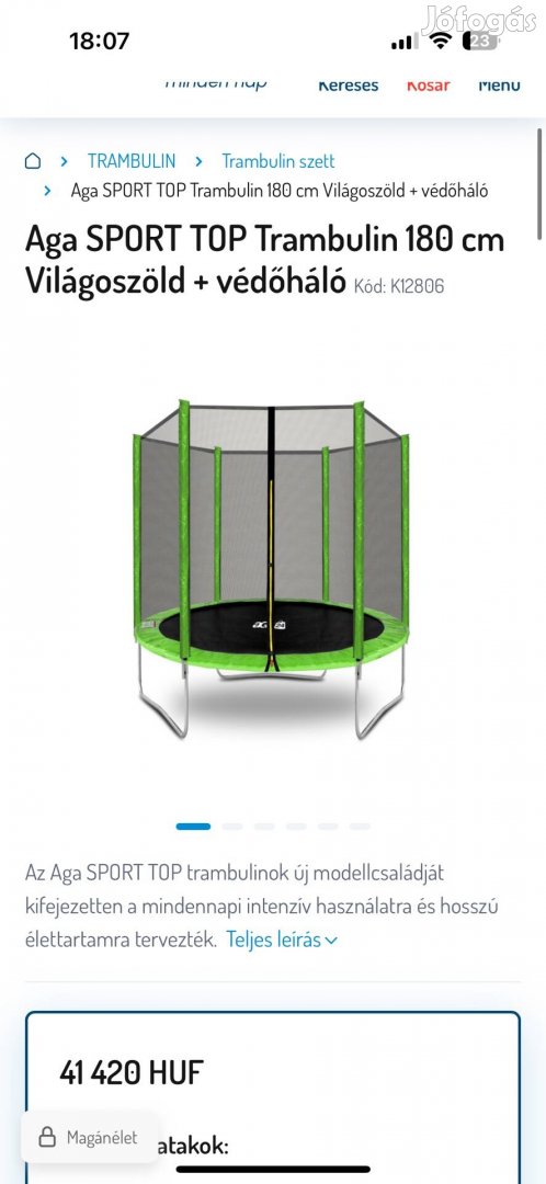 Eladó Aga tranbulin a képen látható 32000 ft kihasználatlanság miatt eladó szinte a kétszer fel volt állítva jár hozzá egy ugró felület még egy vadonatúj ugró felület a háló sosem volt használva az összes tartozékával Sajószentpéter a személyesen átvehető Érdeklődni a telefonszámom itt a jófogáson nem üzletelek csak messengerem és postázni nem tudom a nagy mérete miatt.