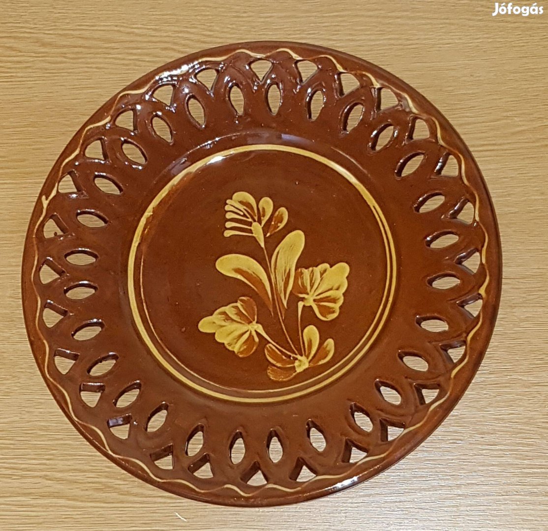 Vagdalt szélű, virágos, mázas barna- sárga mintával átmérője: 27 cm. Kézzel festett, mázas népi fali dísztányér.