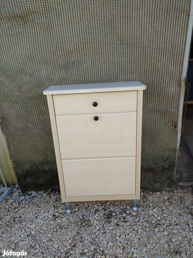 Eladók szép megkímélt állapotban modern vilagos színű cipös szekrény fiókos,cipös polcos része , amely 106 cm magas ,70 cm szélesség ,25 cm mély ,hibátlan szerkezeti és esztétikai állapotban képen minden jól látható Érd telefonon 30/5715106 ,30/3176207 .