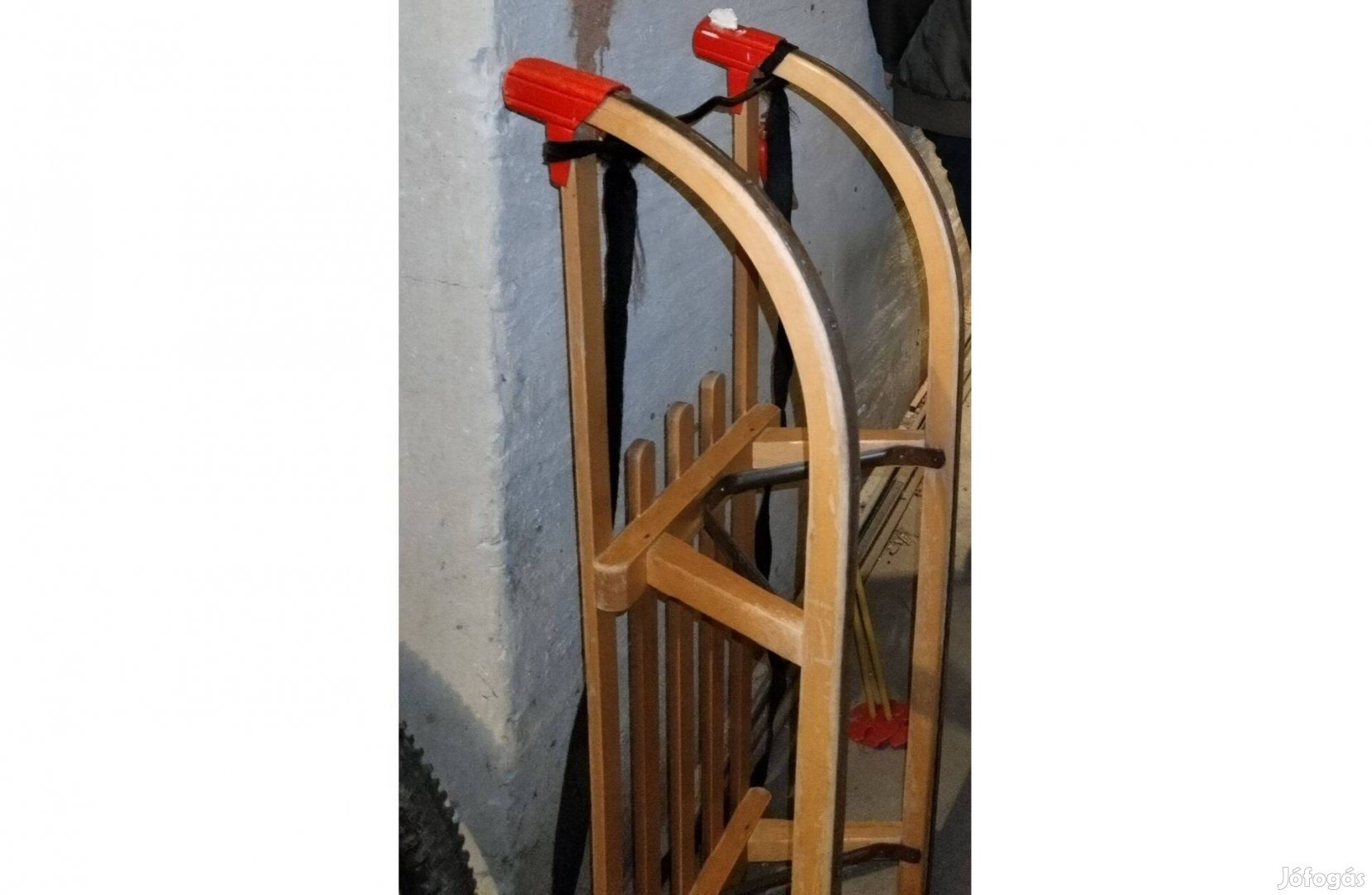 Hagyományos acél talpú keményfa szánkó. Húsz éve használtuk először és ultoljára, azóta a pincében csücsül, várva a hóhelyzet és a gyerekkorunk visszatértét.