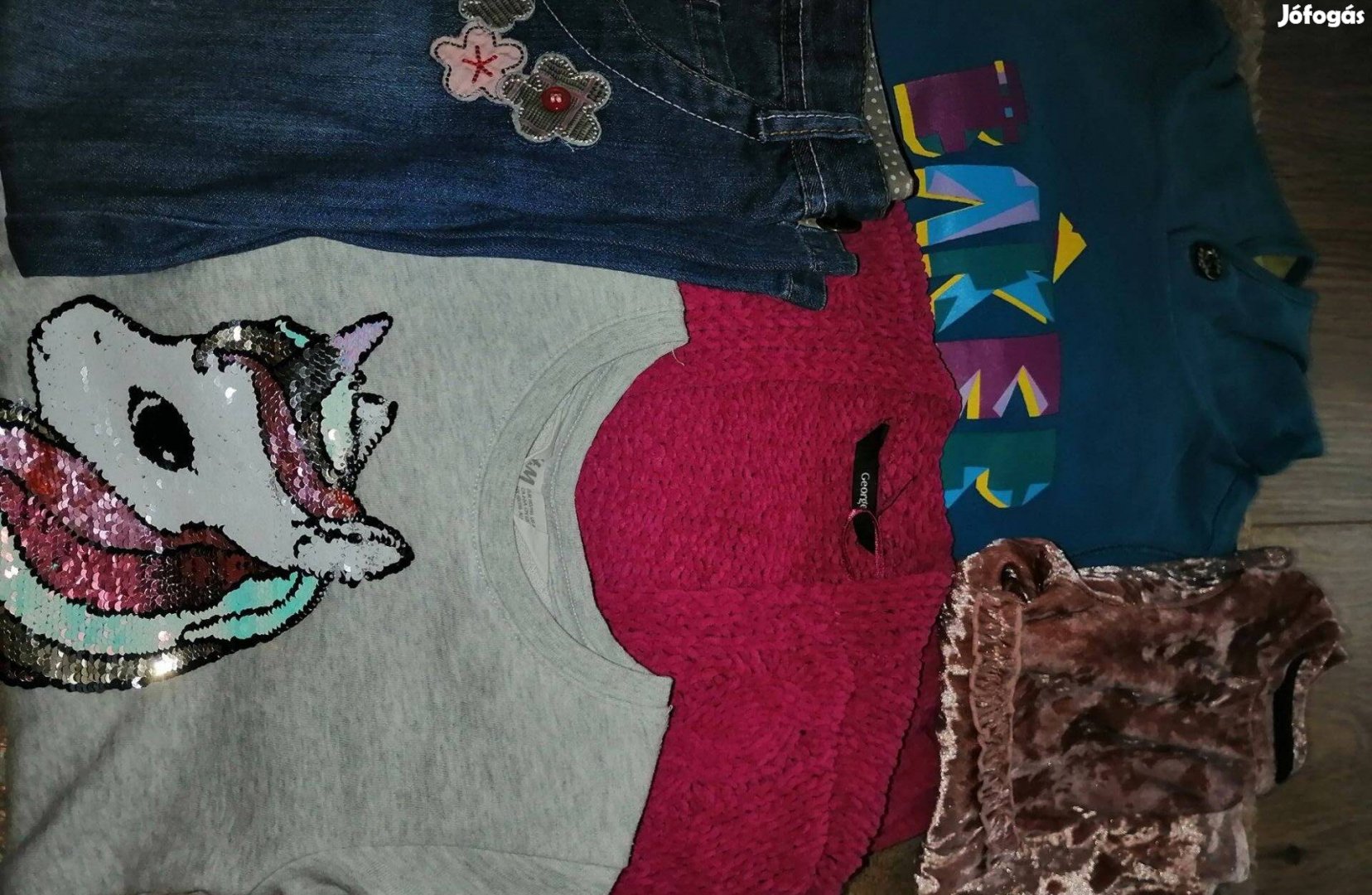 Farmer nadrág, rövid ujjú farmer ruha, kord nadrág, bélelt kord nadrág, kardigán, kapucnis pulóver, elegáns felső, unikornisos ruha, 2 kesztyű.