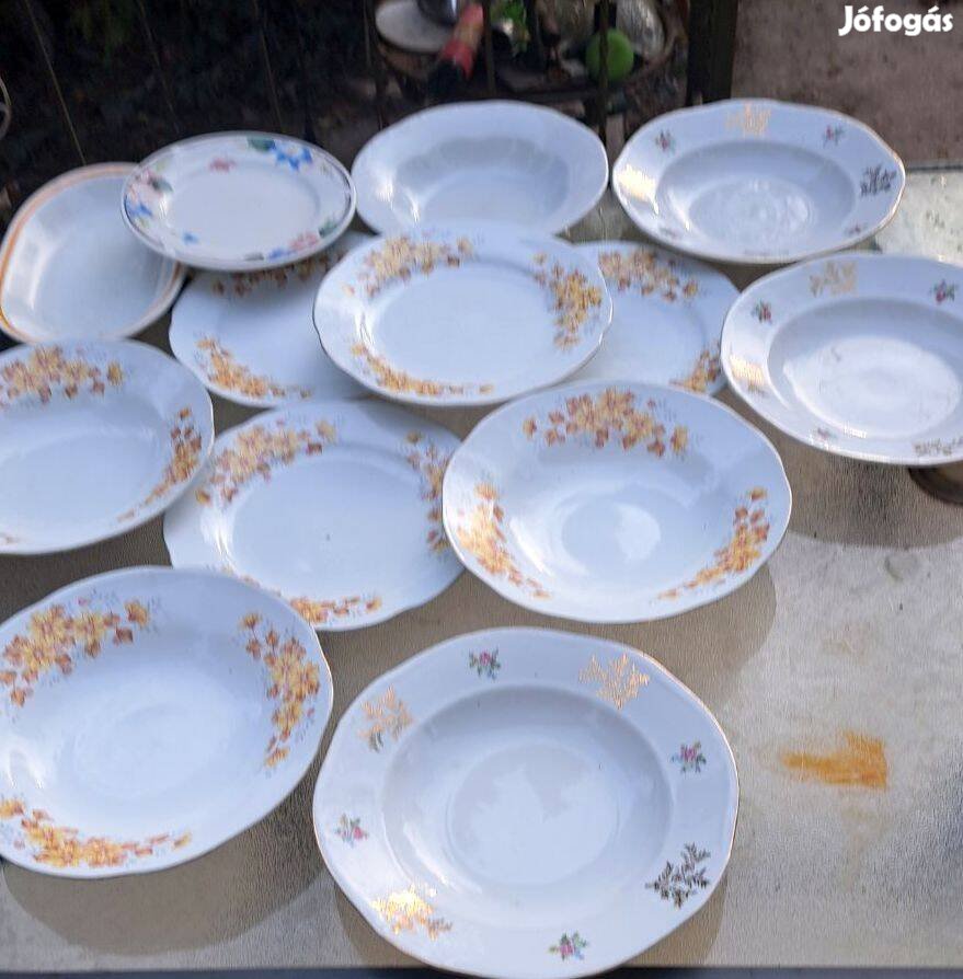 14 db retro porcelán mélytányér virágmintás, aranyozott szélű, vegyes készlet