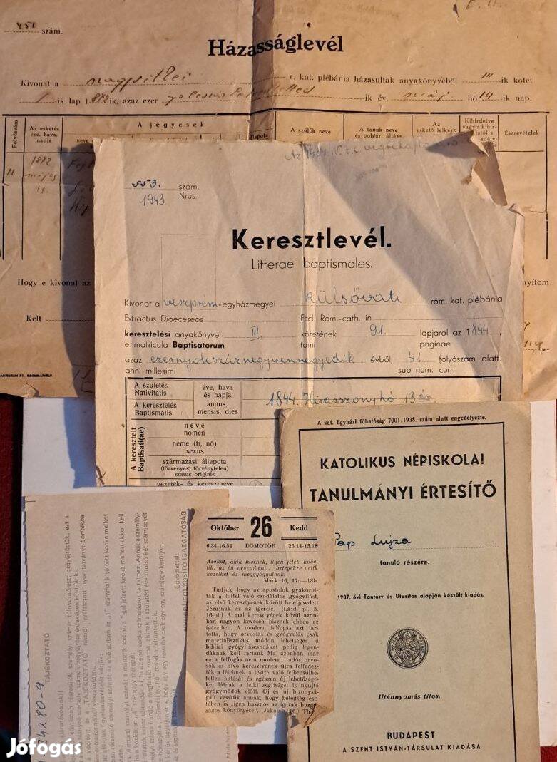 19. századi egyházi anyakönyvi iratok egyben házasságlevél (1872), keresztlevelek, tanulmányi értesítő