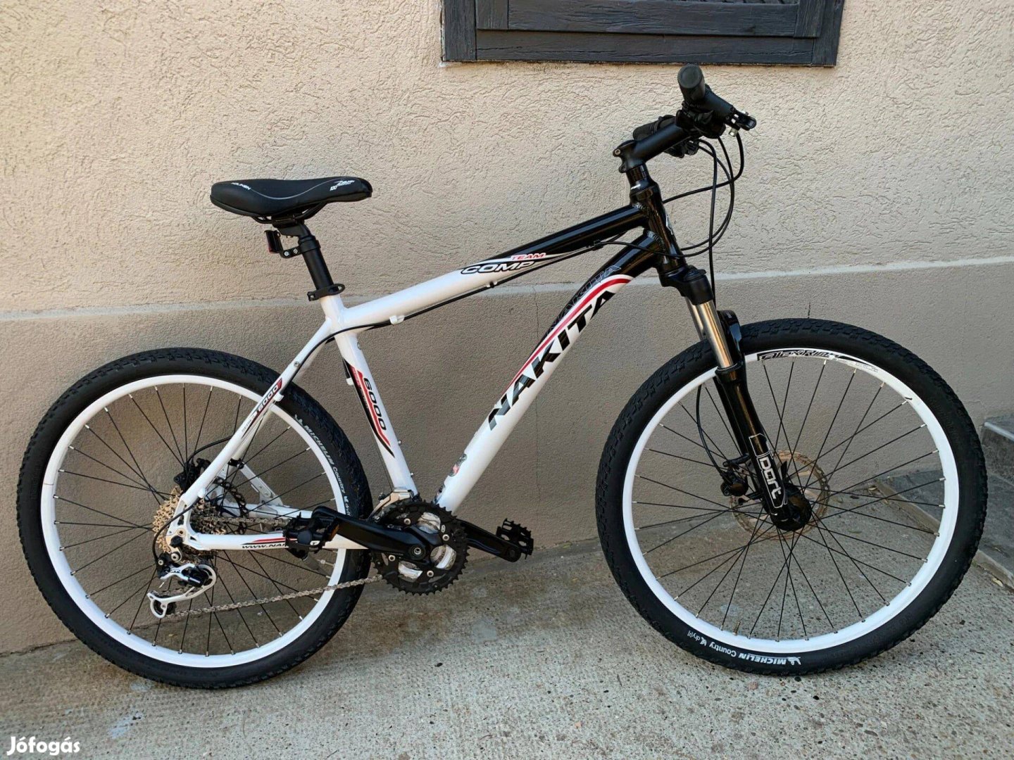 Szép állapotú, 26-os, aluvázas, Nakita Comp Team mtb kerékpár. 27 sebességes, Shimano Deore XT váltóval. Rock Shox Dart 3, lockolható teleszkópos villával. Alexrims, szegecselt, duplafalú felnikkel. Hayes Stroker, hidraulikus tárcsafékekkel. Shimano hajtókarokkal, Shimano kerékagyakkal.