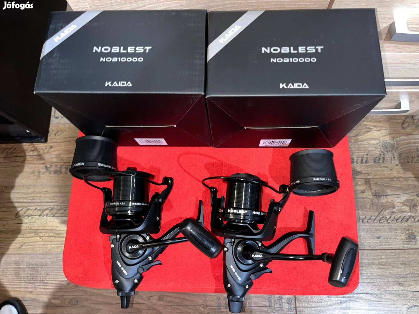 Kaida Noblest 10000 orsó. Felül gyors fékes, alul nyeletőfékes, 7 csapágyas, 100-as méretű távdobós orsó. Lassú dobemeléses, új modell. Alumínium fődob, grafit pótdob. Az adja az orsó méret változását is. Dob váltással 80-as orsóvá alakítható. Csigatengely rendszer. 50 szuper lassú oszcilláció. Gyorshúzó rendszer. Grafit test és rotor. Lebegő rotorvonalvédő. Rozsdamentes acél golyóscsapágy. Rozsdamentes acél tengely és alátét. Azonnali visszaforgásgátló. Az orsó 106 cm zsinórt tekercsel ki a nyél fordulatonként. Az orsó súlya 684 gramm. Könnyített súlyú orsó. Fődob zsinór kapacitása 0,40mm/690m;0,45mm/540m.