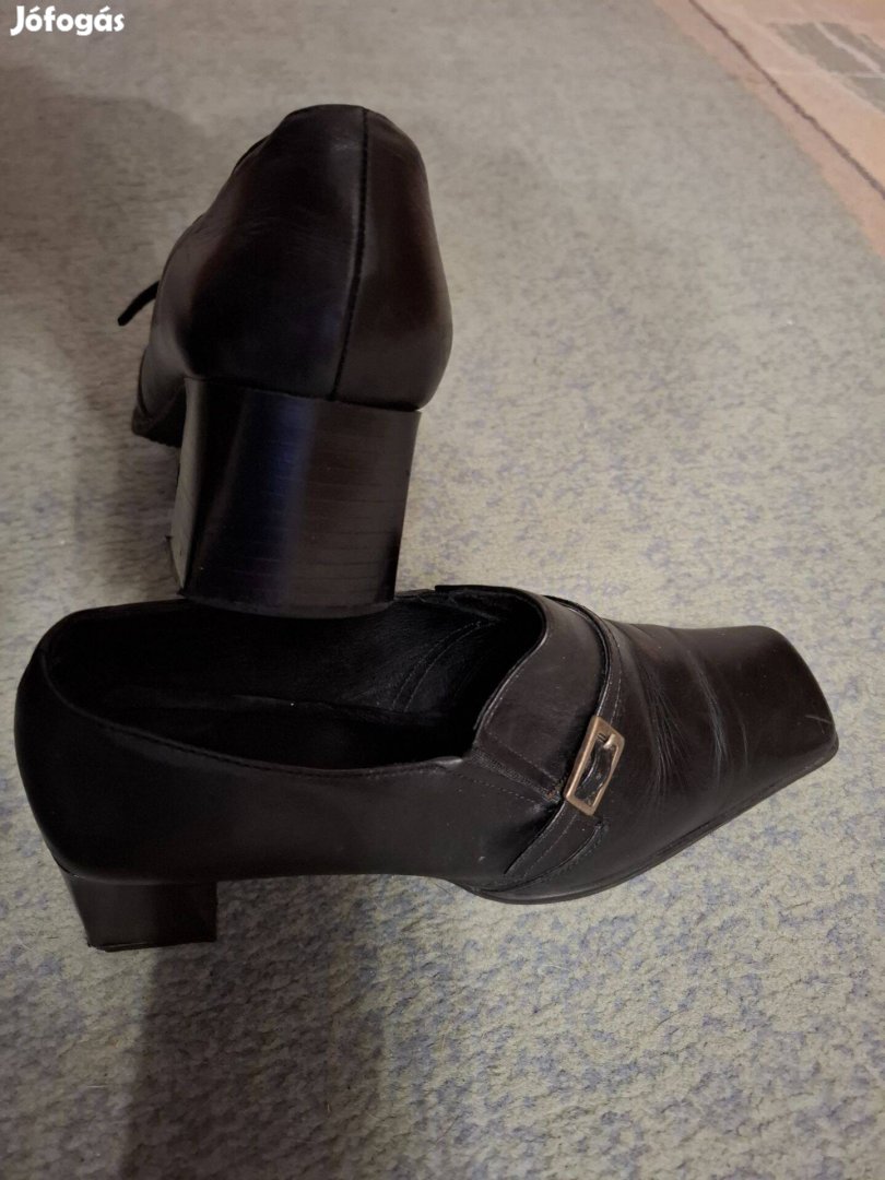 Bőr fekete női félcipő eladó. 37-es méret, széles sarok magassága 5,5 cm. Alkalmi jelleges keveset használt, ezért nincs megkopva sem a felsőrész, sem a talpa.