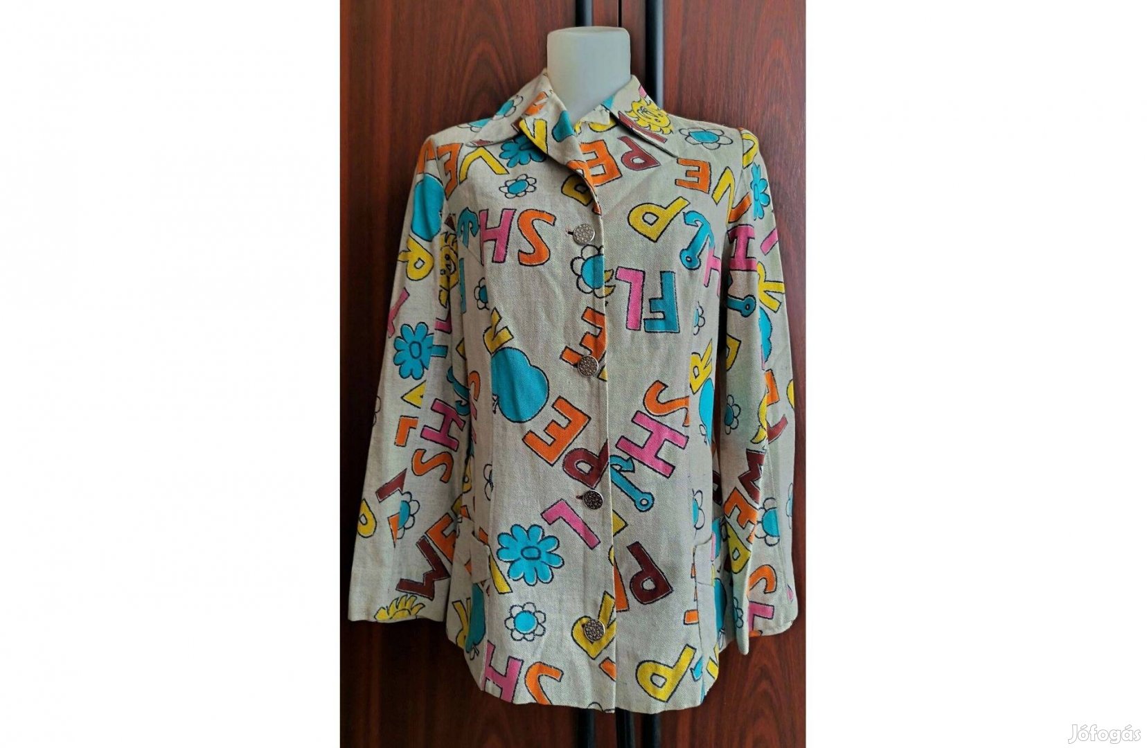 Eladó a képeken látható,női,rendkívül egyedies,retrós,pop-art,pszichadellikus stílusú,deres alapszinü,vászon anyagú béleletlen blézer.Különlegessége többek között hogy egyenes szabású,ún.doboz fazonú.Nem karcsusitott,derékvonal nincs kialakitva,enyhén oversize hatású,csipőig érő hosszúságú.Klasszikus inggalléros,nem túl strukturált természetes vállivű,enyhén bő,egyenes ujjvégű,mandzsetta nélküli hosszú ujjú.Elöl 4 db,a mintázathoz tökéletesen passzoló,közepes,apró csillagokkal dekorált fém diszgomb biztositja a záródását.Közepesen vastag,szövött,kissé rusztikus pamutvászon anyagú,mely tartós és kissé merev hatást kölcsönöz a blézernek,jól tartva a formáját.Elöl két oldalt egy-egy szögletes oldalzseb található rajta,mely praktikus..A 60-as évek világát idéző,élénk,retro betűk és virágok helyezkednek el rajta mintázatként szétszórva,többféle szinben.A minták laza,kézzel rajzolt stilust idéznek,amik egyedi és játékos megjelenést adnak..Ez a blézer a szines,energikus stilusával remek választás lehet azok számára,akik szeretik a különleges és egyedi ruhadarabokat.Ideális hétköznapi kreativ viseletként városi programokhoz,kávézáshoz,sétákhoz,irodai viseletként,kulturális eseményekre.A 60-70-es évek retro stilusát idéző,különleges és egyedi,bohókás,karakteres,kreativ és művészi,első osztályú,hibátlan,szép darab.