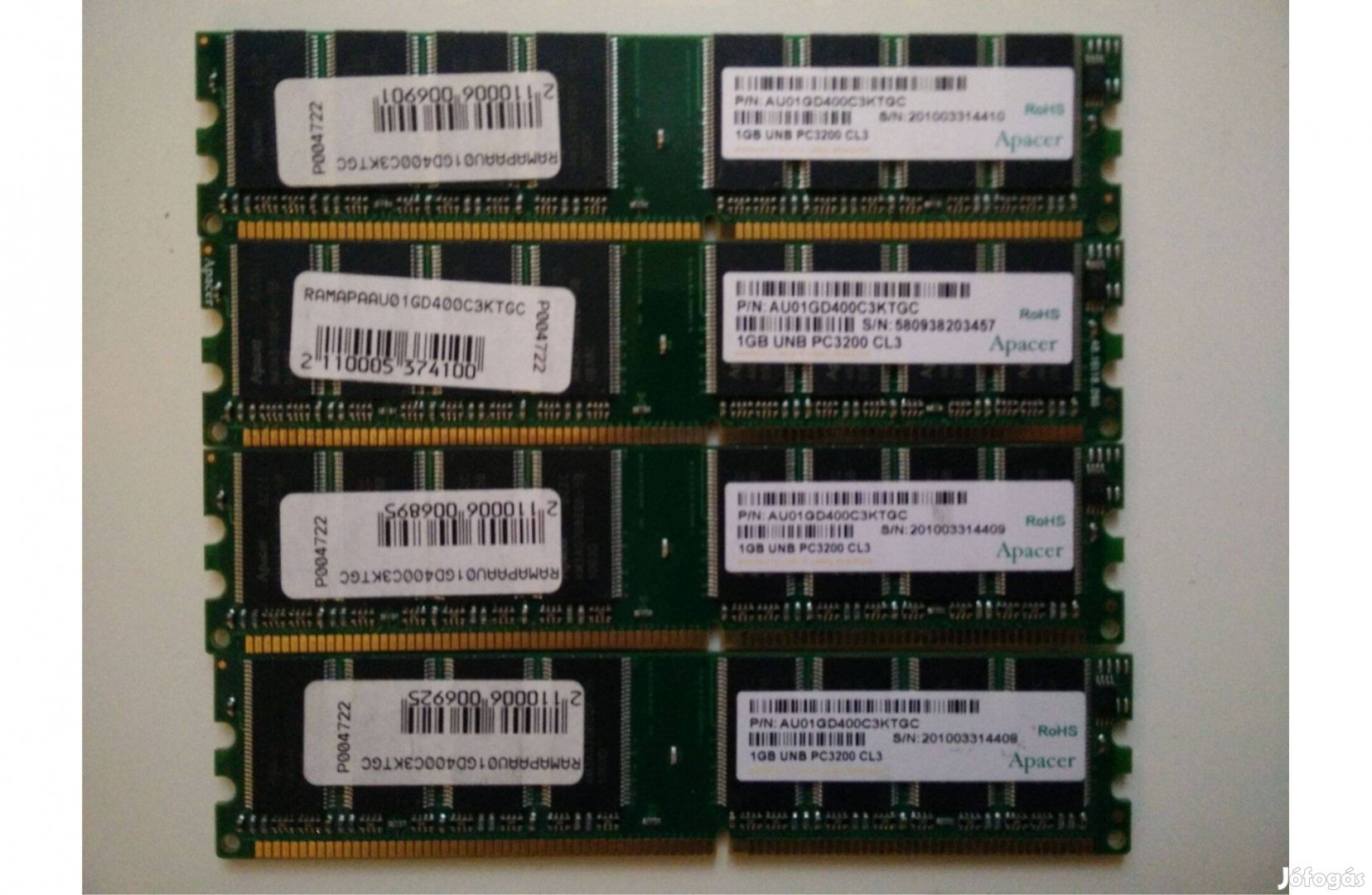 Eladó a képeken látható, asztali számítógépbe való 4 db egyforma Apacer 1 GB (összesen 4 GB) DDR400 (DDR1, PC-3200) 2 oldalas memória egyben, Intel D865PERL alaplapban memtesttel és 32 bites Windows 7-tel tesztelt, működőképes állapotban.