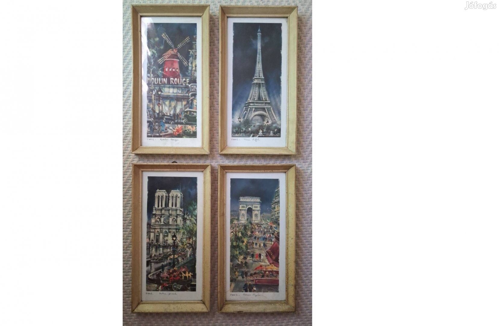 4 db 1960-as évekből származó bekeretezett színes nyomat M.Legendry francia művész szignójával. A párizsi utcaképeken Champion Elysées, Tour Eiffel, Maulin Rouge és Notre Dame megnevezés szerepel. A 4 db kép együttes ára 20.000.-Ft. Gyűjtőknek ajánlott. A kép mérete: 40 x 20 cm.