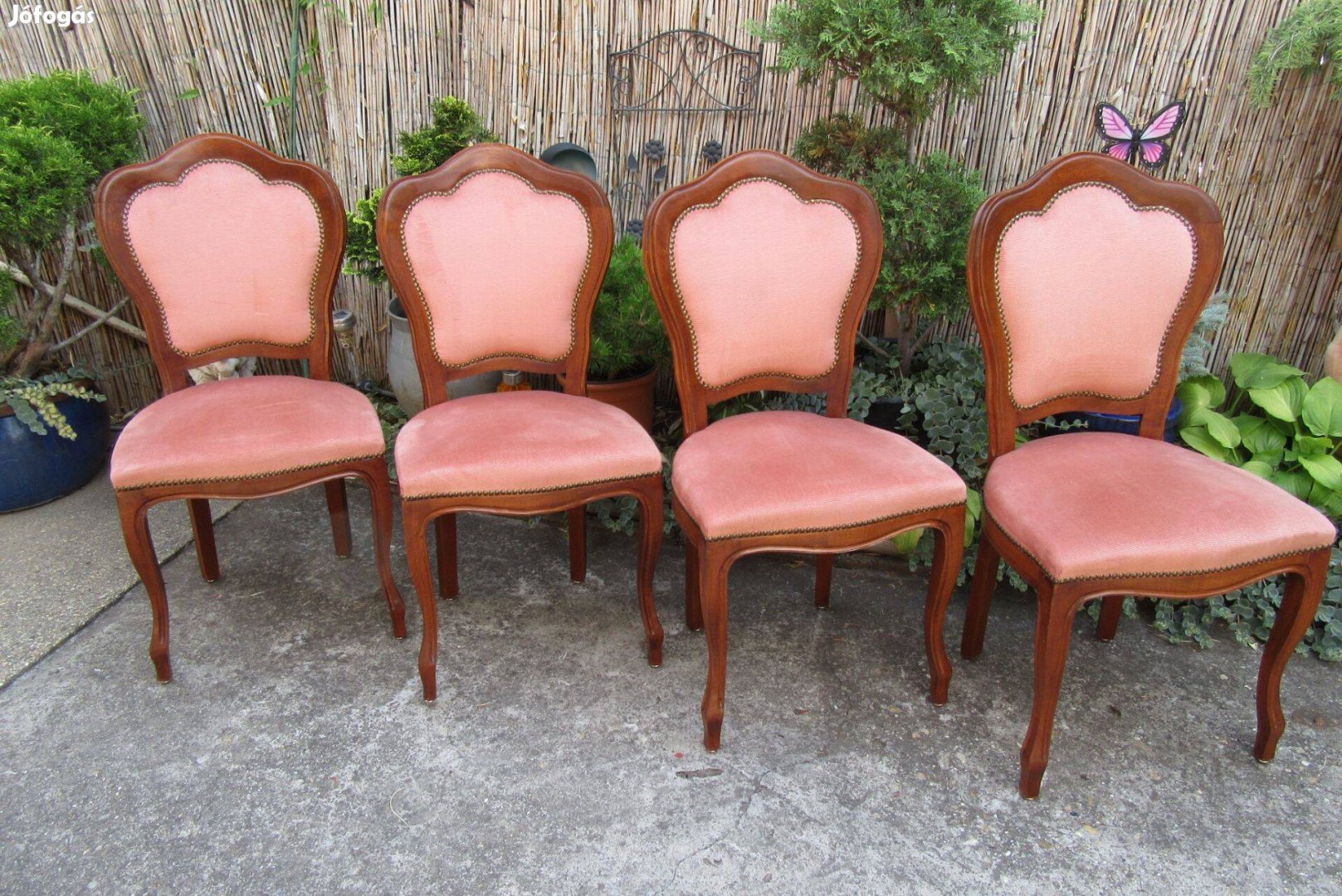 Szép formájú 4 db. chippendale étkező szék, fa szerkezete stabil , púder szövete szép , lásd fotók. 100 cm magas, 50 cm széles, 45 cm mély, 50 ülőmagasság.