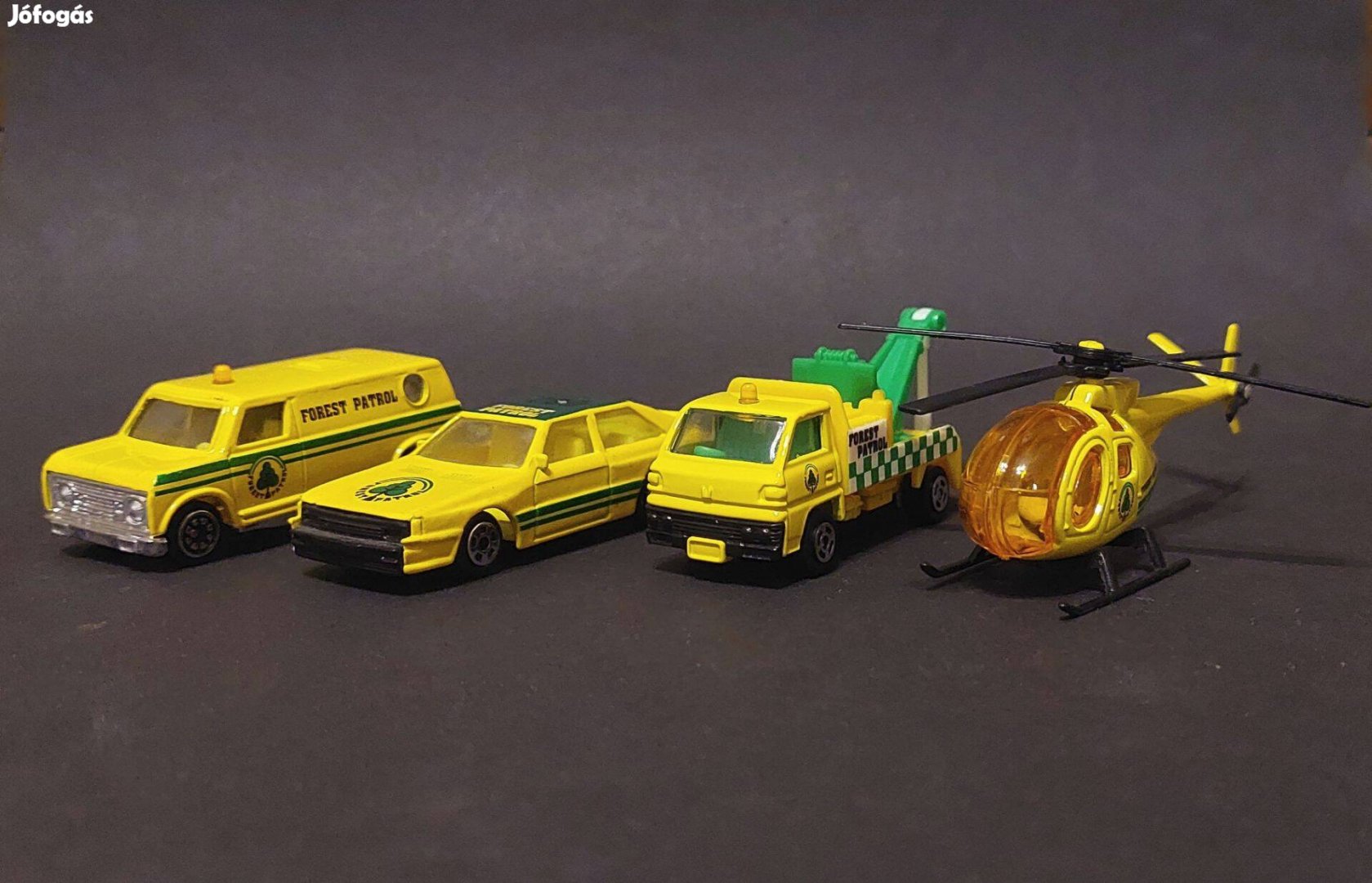 4db set Forest Patrol sárga fém autó kocsi helikopter