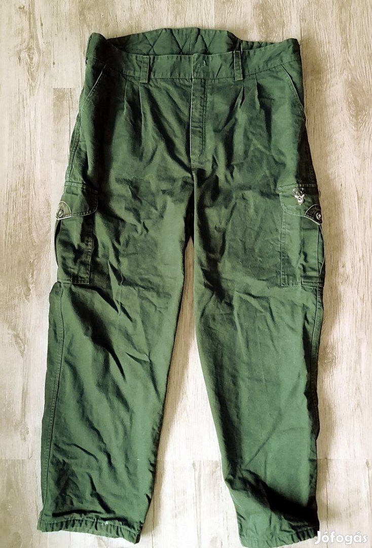 Eladó a képen látható flanel béléses meleg vászon vadászzöld lesnadrág. 100 % pamut, hátul magasított, steppelt vesevédő derék.