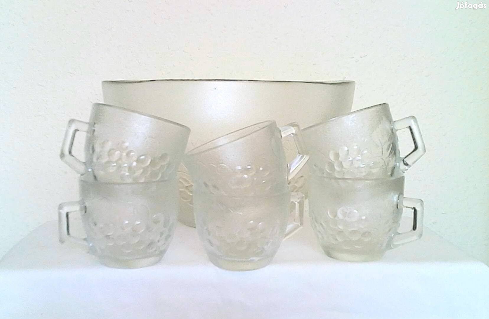 Új, dombormintás üvegből készült bólés puncsos készlet: 1 nagy tál + 6 pohár. Anyaga tartós, vastag üveg, nem törékeny, mosogatógépben mosható.