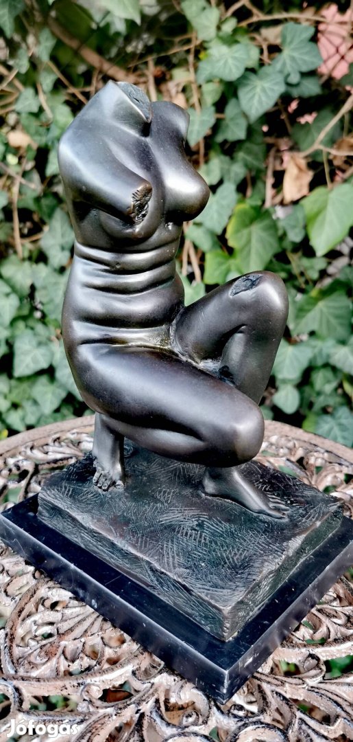 Eladásra kínálok egy rendkívül finom kidolgozású, patinás bronz szobrot, amely egy guggoló női alak klasszikus torzó formáját ábrázolja. Az alkotás harmonikus vonalvezetése, telt idomai és nyugodt kompozíciója időtlen eleganciát és kifinomult művészi hangulatot sugároz. A részletgazdag, texturált bronz felület karaktert és mélységet ad a szobornak, amelyet egy elegáns, polírozott fekete márvány talapzat tesz teljessé, kiemelve az alkotás exkluzív megjelenését.