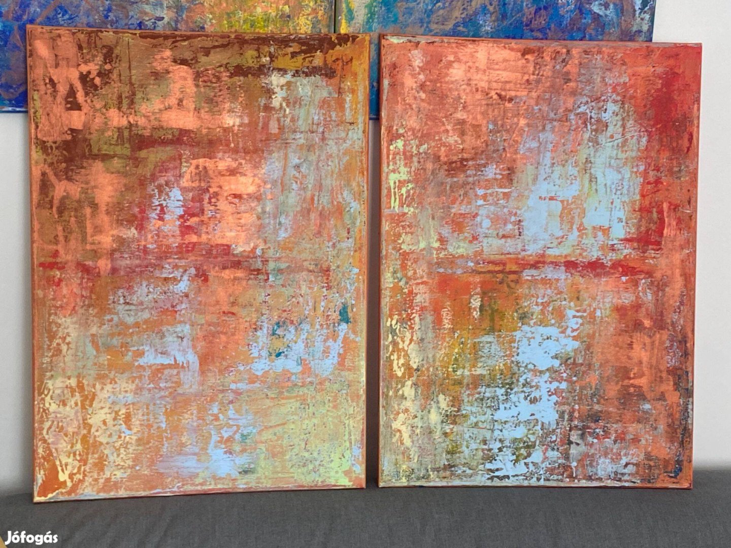 2 db 50x70 cm-es vászon. Darabja 25.000 Ft. Az ősz színeiben, réz kiegészítéssel. Egyedi készítés, akrillal készült festmény. Jól mutat fehér falon, feldobja a szobát, irodát, nyaralót.