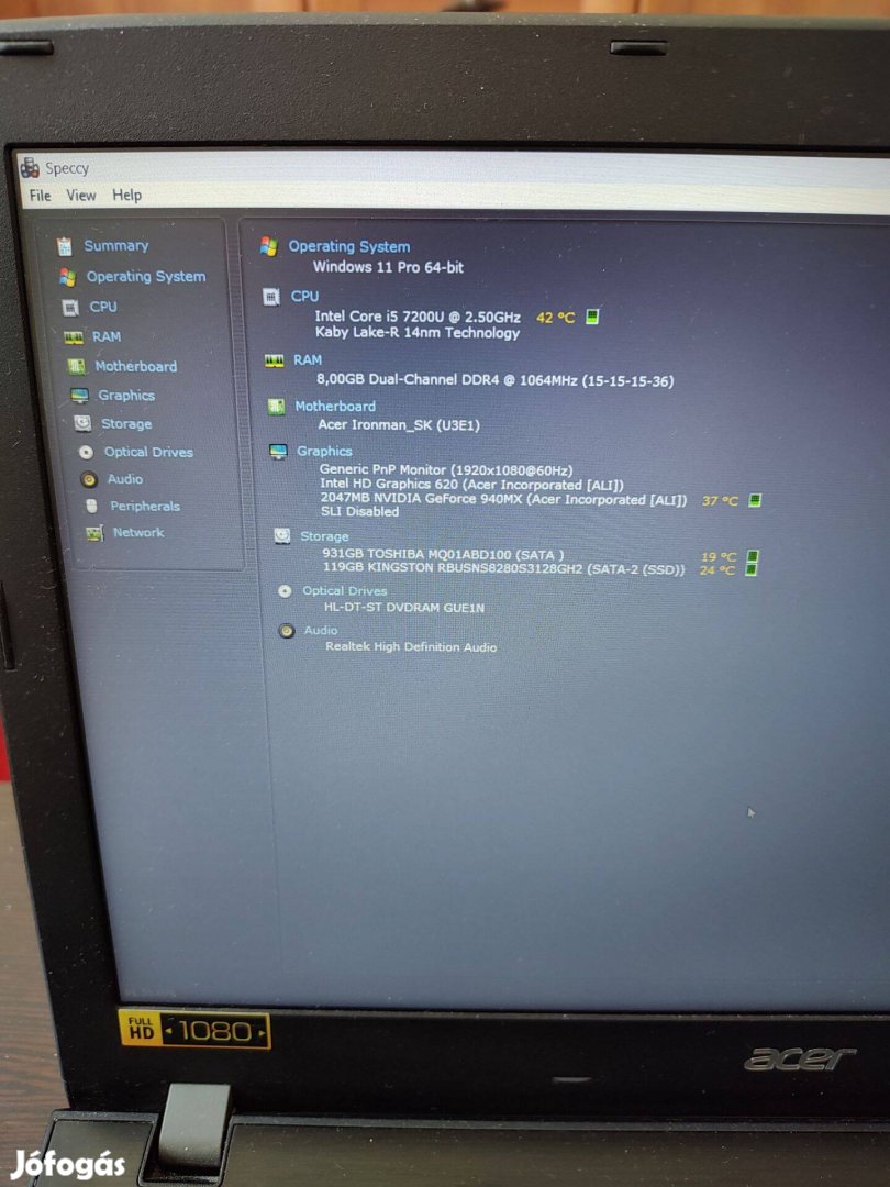 Acer i5 7.gen 8gb ddr4 ram,2gb VGA Nvidia mx940,1tb hdd-128gb SSD,akku 1 órát bír,ha kérdés van írj