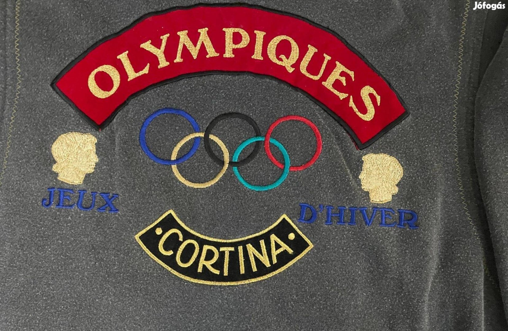 Vintage 80-as 90-es évekbeli Adidas Olympics pulóver, kerek nyakú, Grenoble 1968 Cortina 1956 St. Moritz 1948 Olimpiques Jeux D'Hiver S méret Szürke-Kék 60% pamut és 40% poliészter