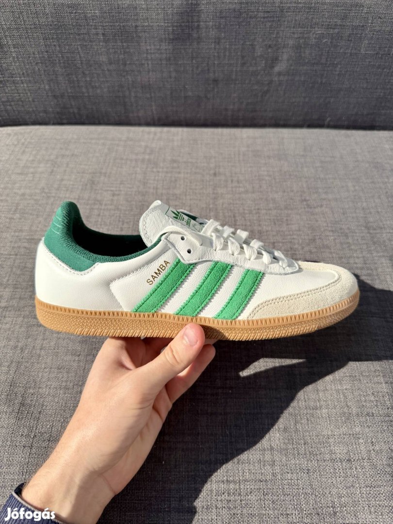 Eladó egy vadonatúj, eredeti Adidas Samba OG a legkeresettebb fehér-zöld színkombinációban! Ez a modell jelenleg a sneaker világ abszolút sztárja. Prémium bőr felsőrész, hasított bőr orr-rész és a klasszikus barna gumitalp. Elegáns, sportos és minden szetthez passzol.
